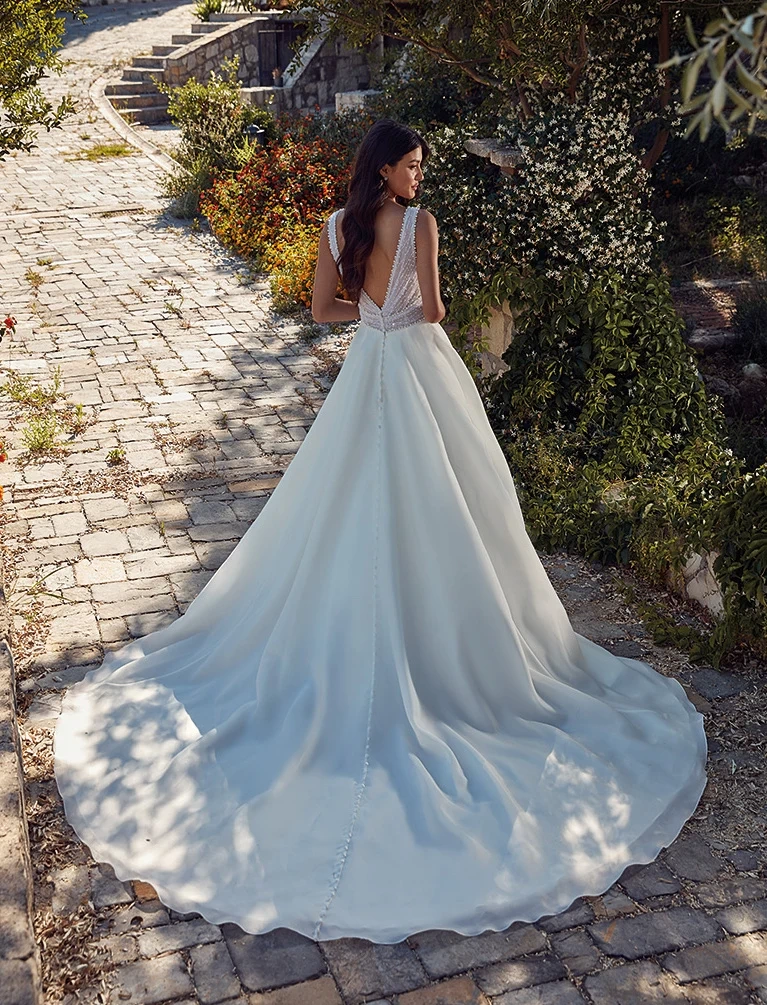 La schiena è valorizzata da un’ampia scollatura a V, che dona un tocco di sensualità mantenendo una raffinata sobrietà. La chiusura è arricchita da una lunga fila di bottoncini rivestiti, che proseguono fino all'inizio dello strascico. Lo strascico morbido e fluido aggiunge movimento e maestosità, rendendo ogni passo della sposa un vero spettacolo.Un abito perfetto per chi desidera uno stile senza tempo, elegante e sofisticato, che cattura la luce e l’attenzione.