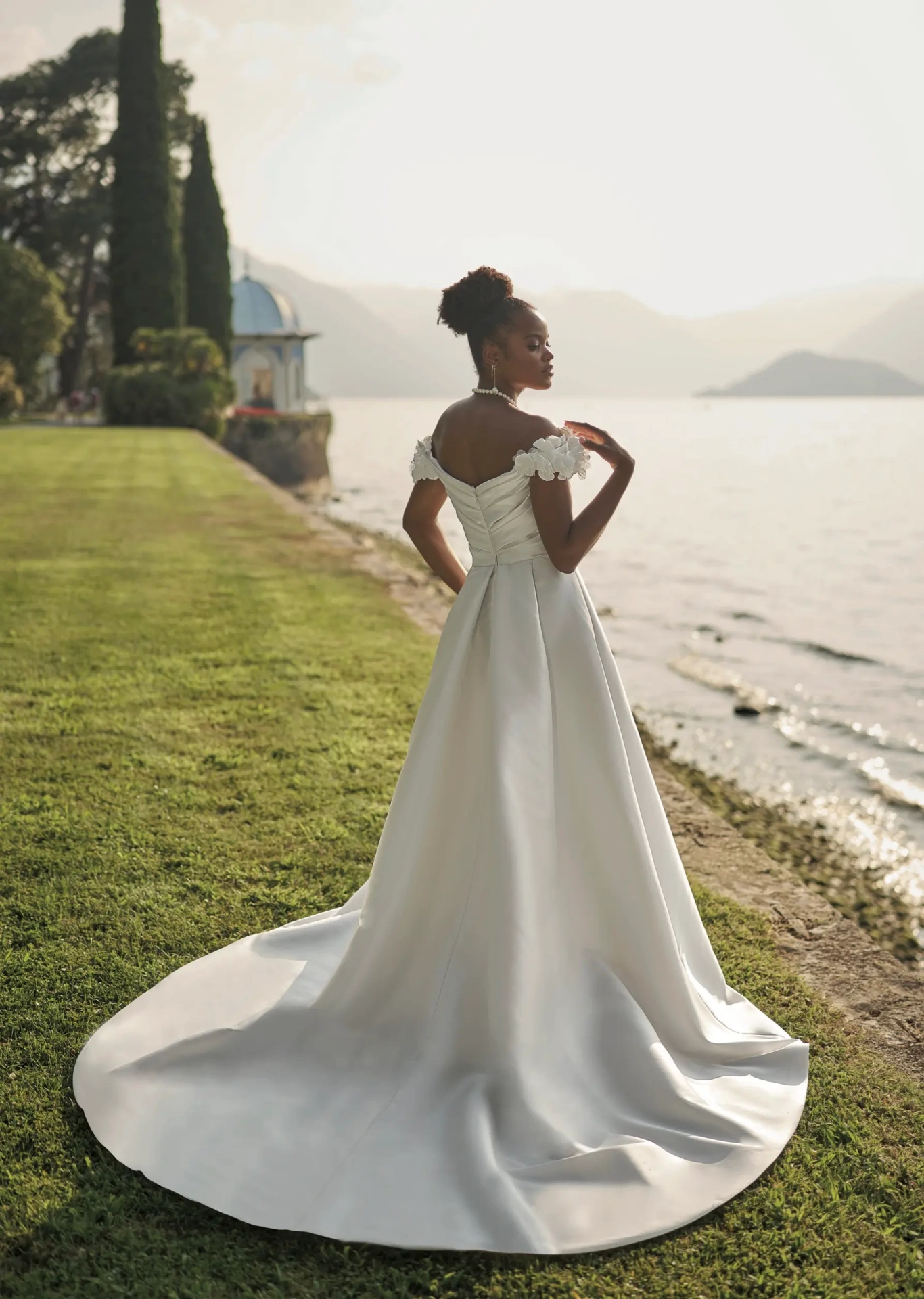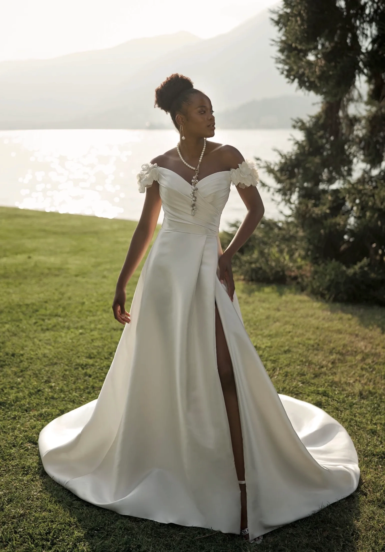 Il modello Margot, della Nuova Collezione Sposa firmata Modeca, è un modello in mikado che unisce charme e modernità. Il bustino drappeggiato, con scollo a cuore e spalle scoperte, valorizza la figura con delicatezza. Le maniche con fiori tridimensionali aggiungono romanticismo e originalità, mentre lo spacco laterale regala un dettaglio audace e femminile. Un abito pensato per la sposa che vuole sentirsi elegante ed unica!