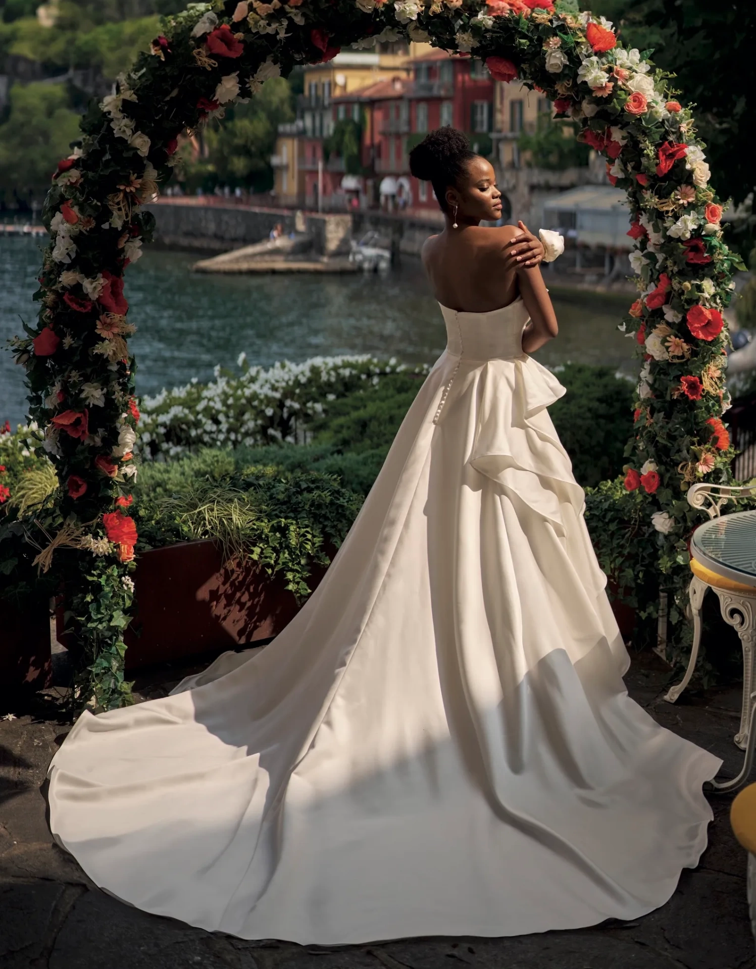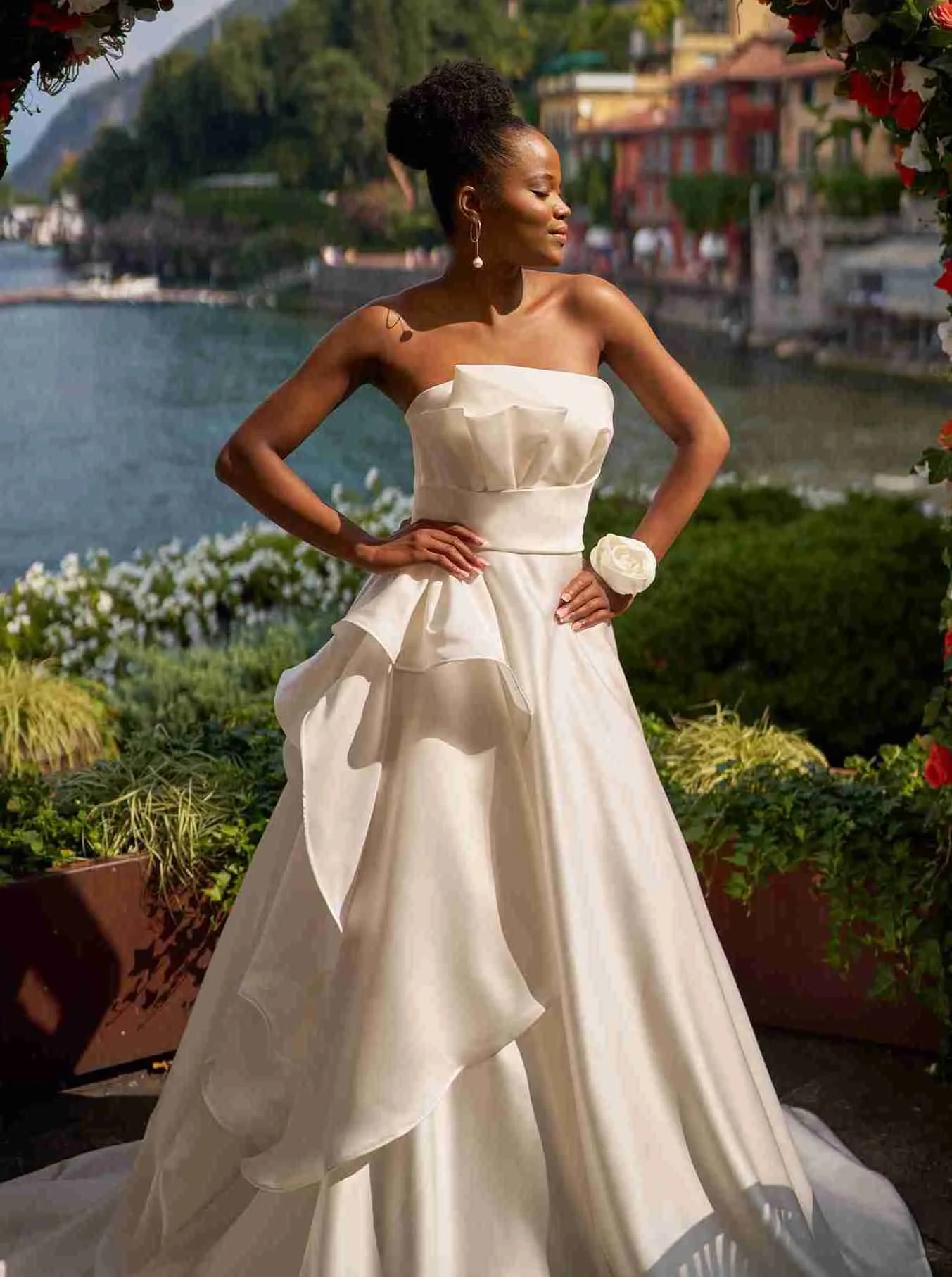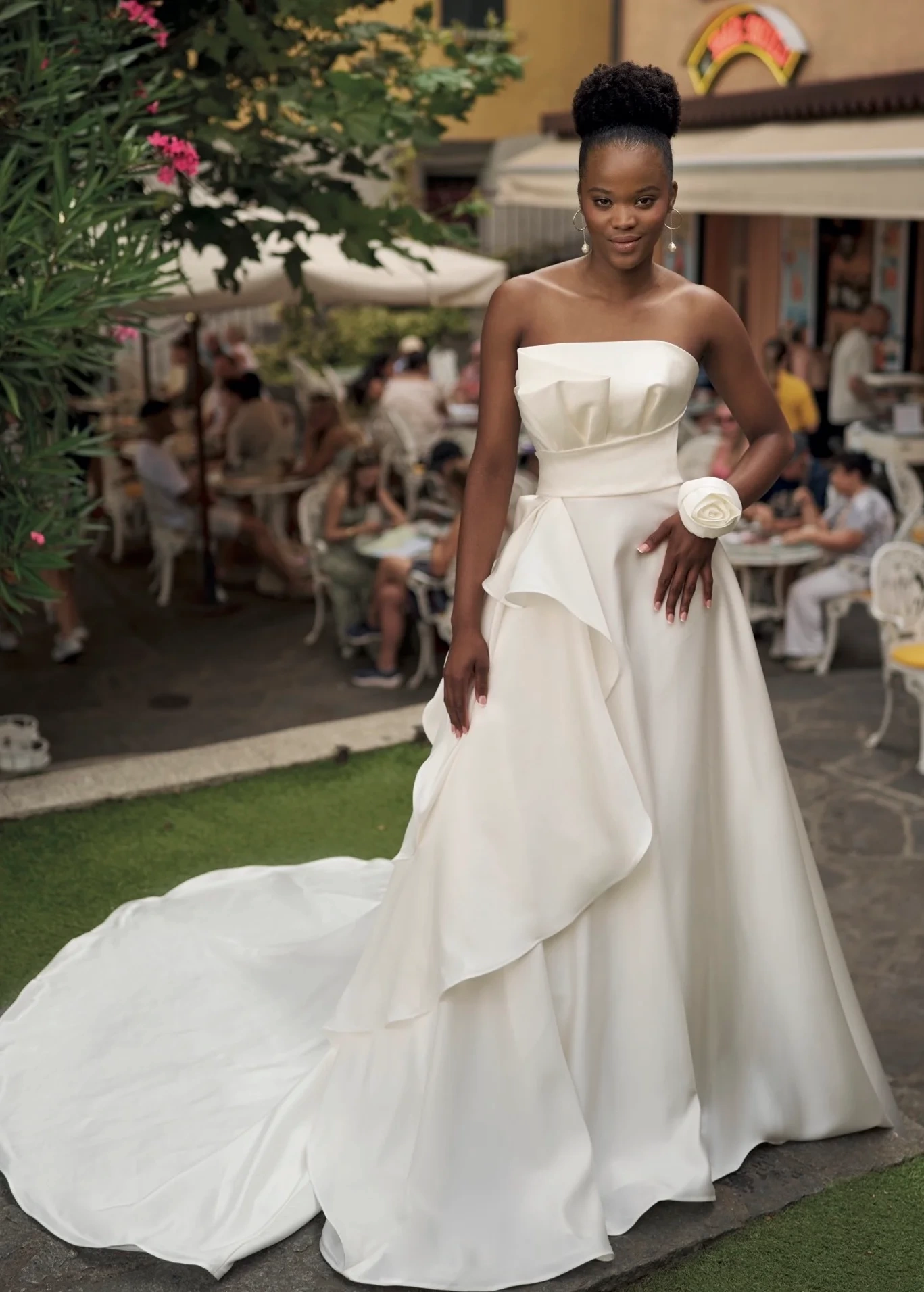 Il modello Meribel, della Nuova Collezione Sposa firmata Modeca, è un abito scultoreo che unisce eleganza e modernità con estrema naturalezza. Il corpetto strutturato senza spalline si distingue per le sue pieghe sartoriali dal gusto architettonico, che mettono in risalto la silhouette con stile e personalità. La gonna in mikado, ampia e fluida, è arricchita da un drappeggio asimmetrico che cade morbido sul fianco, aggiungendo movimento e carattere. Il lungo strascico completa il look con un tocco scenografico. Perfetto per una sposa raffinata, dal gusto contemporaneo e sicuro.