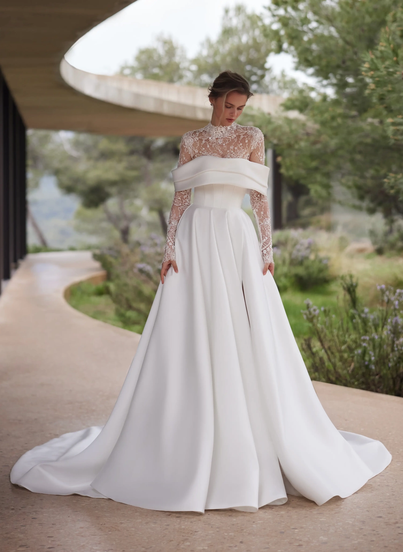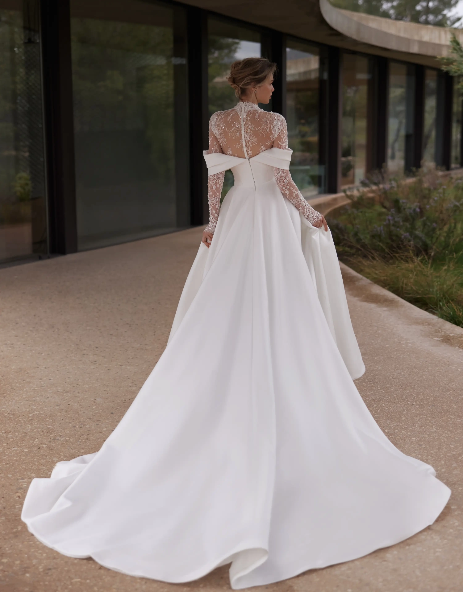 Il modello Mori, della Nuova Collezione Sposa firmata Eva Lendel, in mikado dal design essenziale e scultoreo è una dichiarazione di eleganza senza tempo. Il corpino con stecche a vista scolpisce la silhouette e sostiene con grazia, mentre la scollatura off-shoulder avvolge le spalle con linee pulite e moderne. La gonna ampia, strutturata e impeccabile nella sua caduta, accompagna ogni passo con maestosità. L’abbinamento con il bolerino in pizzo ricamato aggiunge un tocco di romanticismo e raffinatezza, perfetto per una cerimonia religiosa o per un cambio look durante la giornata. Un abito pensato per la sposa che sogna un'eleganza contemporanea, sobria ma d'impatto, che non rinuncia al fascino sartoriale.