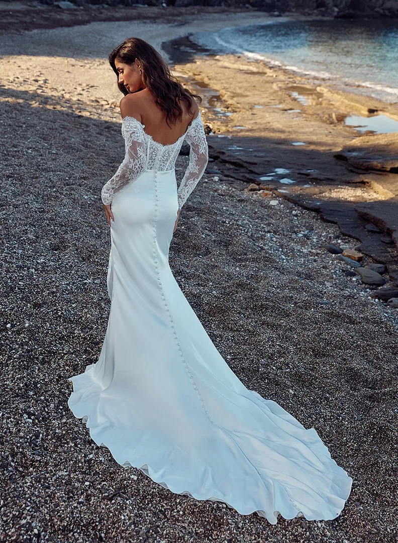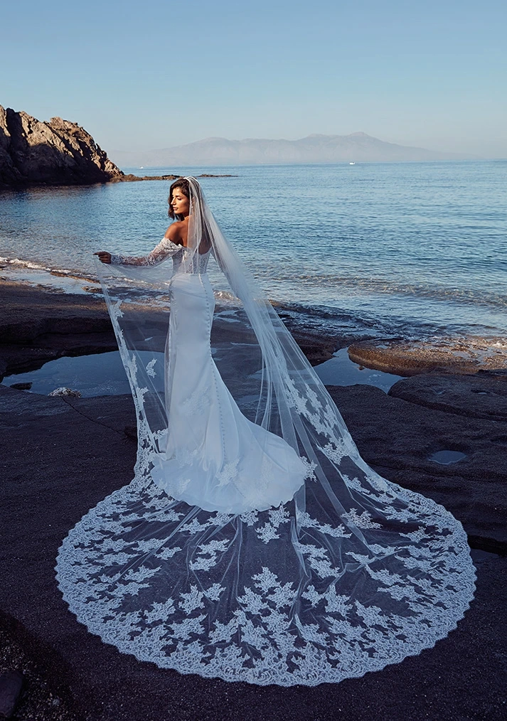 Il modello Ornella della Nuova Collezione Sposa è una celebrazione di sensualità moderna e audacia raffinata. Questo abito si distingue per il suo corpetto in pizzo trasparente con scollatura off-shoulder che sfiora le spalle, creando un effetto seducente e femminile. Le maniche lunghe in prezioso pizzo francese floreale avvolgono le braccia con una leggera trasparenza, mentre la gonna in raso lucido accarezza la silhouette con un elegante drappeggio laterale, rivelando un inserto in pizzo che aggiunge un tocco di mistero. Un dettaglio pensato per una sposa che desidera sorprendere senza rinunciare all'eleganza.Il retro dell’abito si caratterizza per una fila di bottoni che scivola lungo la schiena, proseguendo fino alla coda fluida che segue dolcemente i movimenti della sposa. Il velo in pizzo ricamato completa il look, offrendo un tocco etereo e sofisticato. E' perfetto per una sposa che ama osare, senza compromessi, scegliendo un abito che unisce romanticismo e sensualità con uno stile contemporaneo e di carattere.
