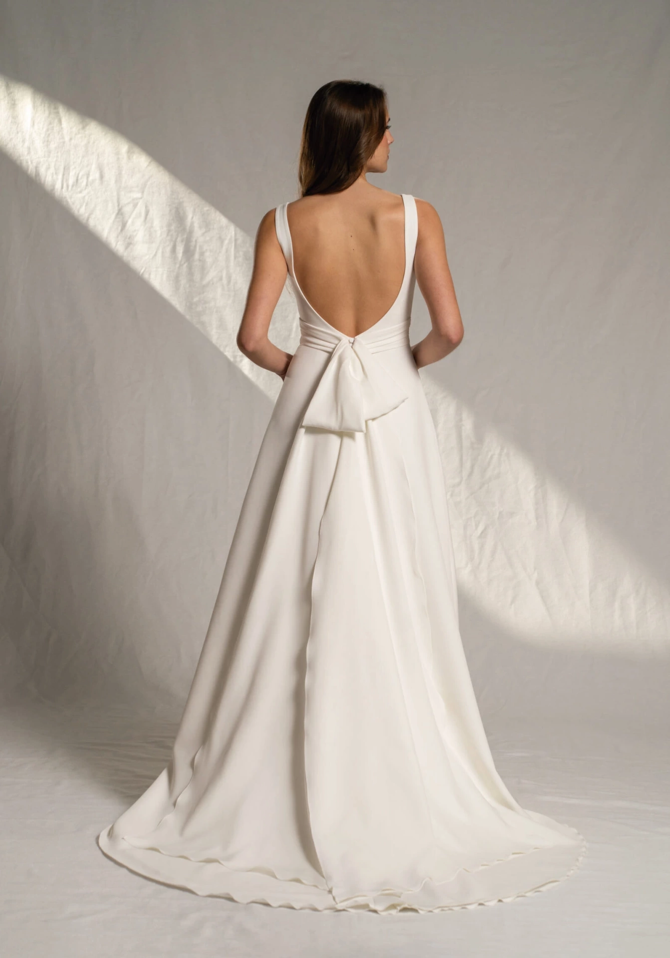 A rendere unico questo modello è il fiocco posteriore: un dettaglio couture che dona volume e un tocco di romanticismo senza tempo. Perfetto per la sposa che desidera un look elegante, essenziale, ma con un twist speciale.