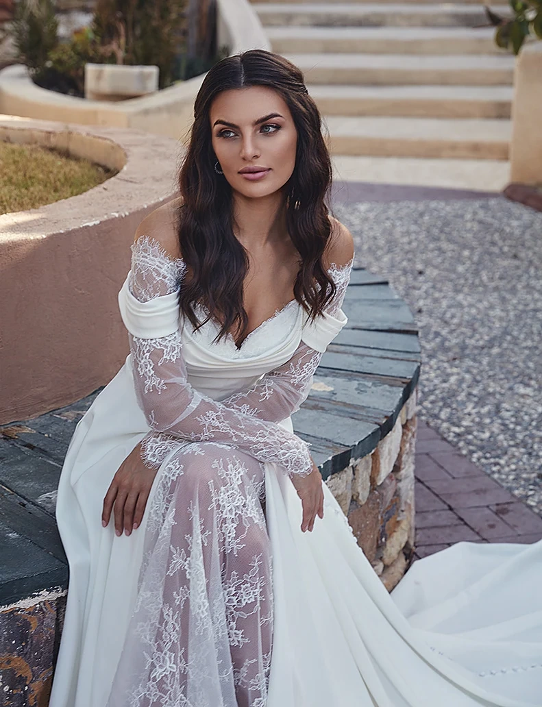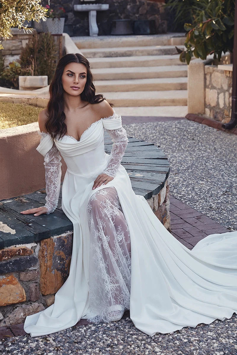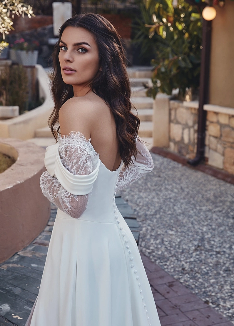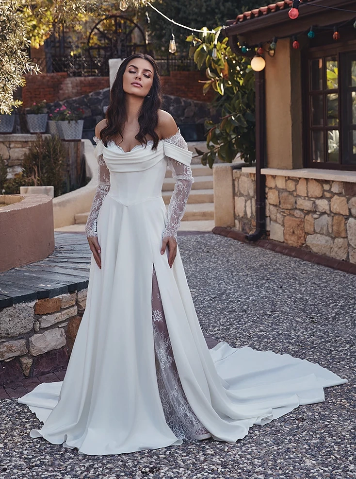 Il modello Trisha della Nuova Collezione Sposa è un perfetto connubio di eleganza classica e sensualità moderna. Caratterizzato da un corpino con spalle scoperte e maniche lunghe in pizzo, l'abito unisce il fascino delle trasparenze alla raffinatezza dei dettagli.