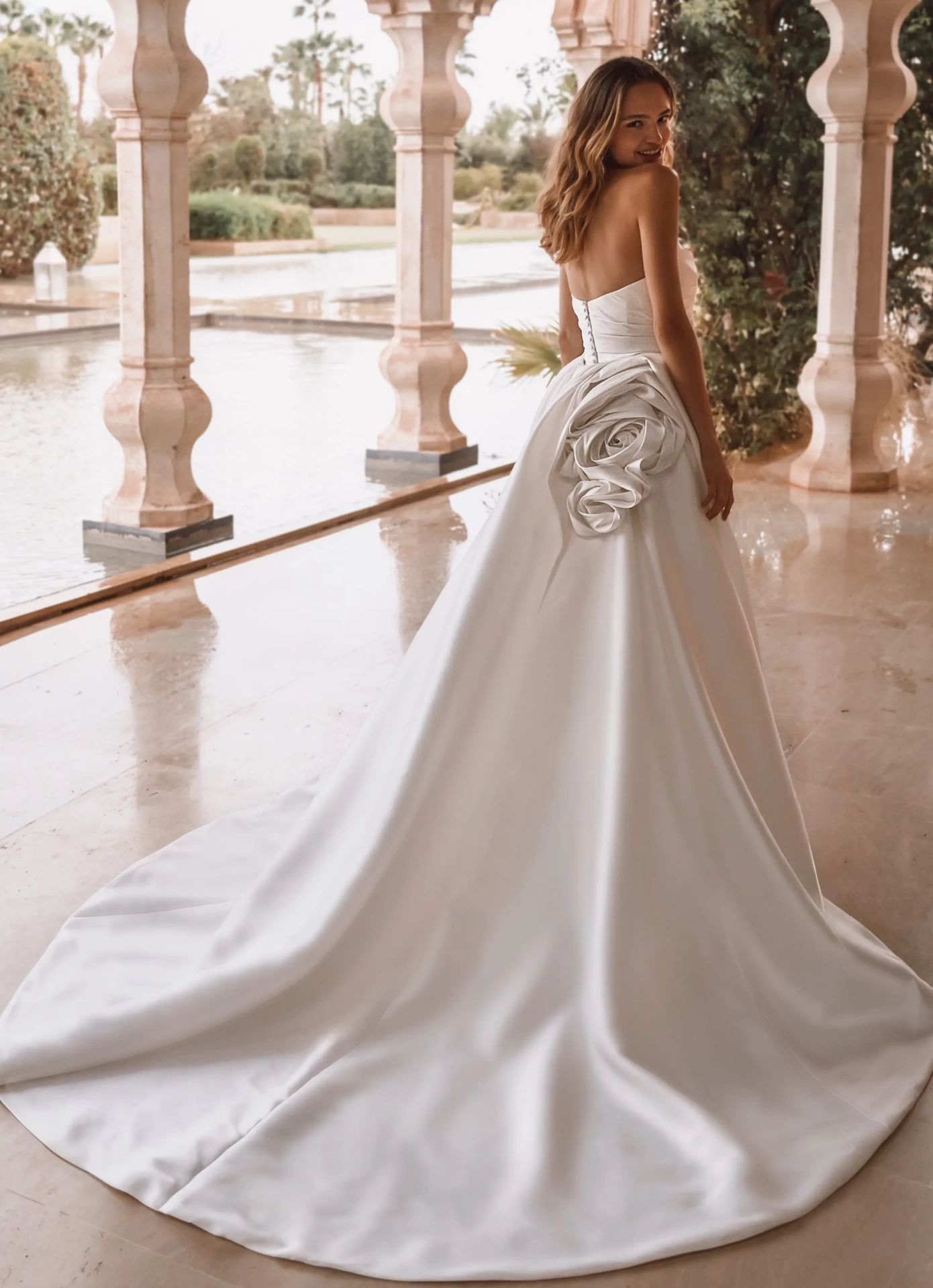 Il primo abito, realizzato in mikado lucente, avvolge la silhouette con linee drappeggiate che valorizzano il punto vita e un elegante scollo dritto, pulito e strutturato. A renderlo ancora più scenografico, una gonna ampia con maxi fiore couture sul retro e una coda importante: perfetta per un ingresso in chiesa da vera protagonista. Ma il vero colpo di scena arriva con il secondo look: rimuovendo la sopragonna, l’abito si trasforma in una sirena moderna e minimal, con una schiena valorizzata da una raffinata fila di bottoncini rivestiti che segue ogni curva con delicatezza. Un abito, due momenti: romantico per la cerimonia, glamour per la festa. Perfetto per: la sposa elegante che ama stupire, senza rinunciare alla raffinatezza.