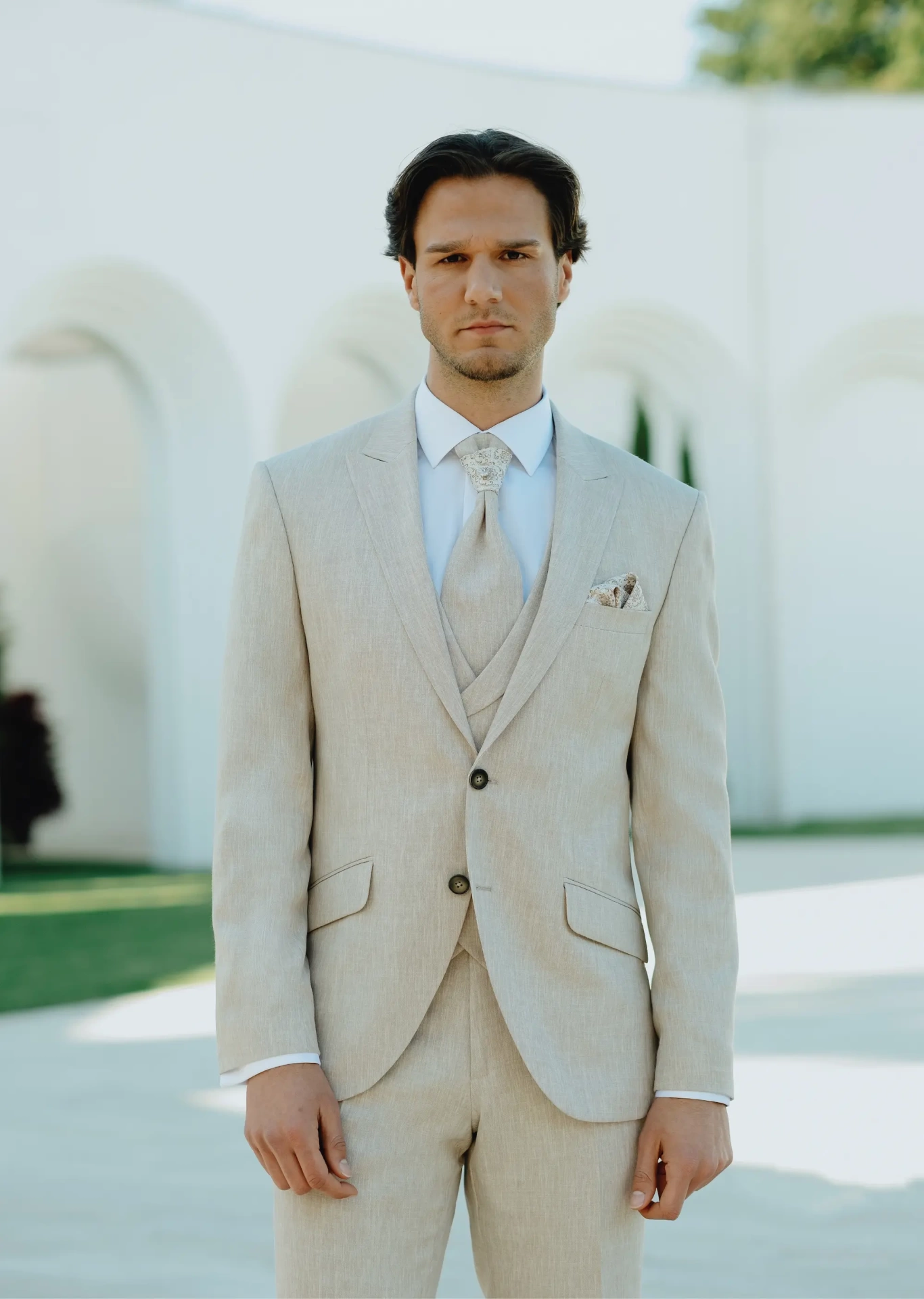 La delicata tonalità beige, luminosa e naturale, lo rende perfetto per lo sposo che desidera distinguersi con eleganza, senza rinunciare alla leggerezza di un mood boho. La giacca dalla linea pulita e sartoriale si abbina a un gilet coordinato con rever, creando un equilibrio armonioso tra struttura e morbidezza. La cravatta o papillon tono su tono completa il look con discrezione, mentre i dettagli curati e la vestibilità impeccabile valorizzano la figura in modo naturale. Un abito ideale per matrimoni all’aperto, location immerse nel verde, ville, giardini o cerimonie dal gusto rilassato ma ricercato. Pensato per lo sposo che ama uno stile autentico, raffinato e senza tempo.