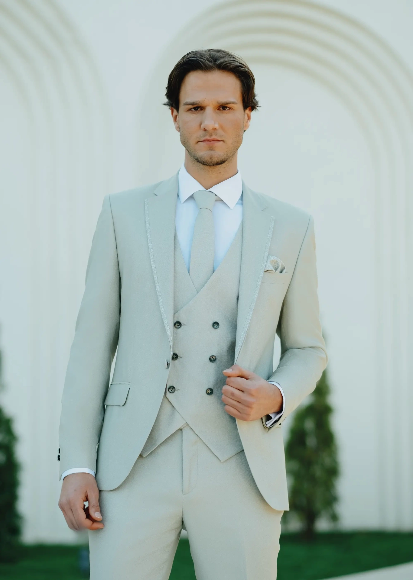 La delicata tonalità verde polvere, luminosa e naturale, lo rende perfetto per lo sposo che desidera distinguersi con eleganza, senza rinunciare alla leggerezza di un mood boho. La giacca dalla linea pulita e sartoriale si abbina a un gilet coordinato con rever, creando un equilibrio armonioso tra struttura e morbidezza. La cravatta o papillon tono su tono completa il look con discrezione, mentre i dettagli curati e la vestibilità impeccabile valorizzano la figura in modo naturale. Un abito ideale per matrimoni all’aperto, location immerse nel verde, ville, giardini o cerimonie dal gusto rilassato ma ricercato. Pensato per lo sposo che ama uno stile autentico, raffinato e senza tempo.