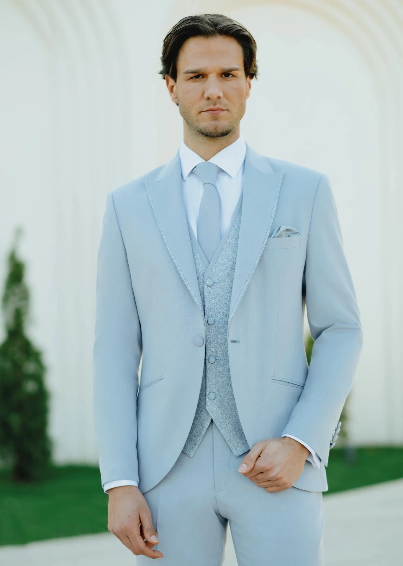 Abito da sposo in tonalità azzurro polvere, raffinato e luminoso, pensato per lo sposo che desidera distinguersi con eleganza contemporanea e grande versatilità. La giacca è caratterizzata da un rever staccabile, che permette di trasformare il look: una volta rimosso, rivela un rever sottostante tono su tono, per uno stile più pulito e moderno, ideale anche per i momenti più informali della giornata. Il gilet è reversibile, realizzato da un lato in tessuto liscio e dall’altro in una preziosa lavorazione damascata, per adattarsi a diverse interpretazioni dello stesso abito. La possibilità di scegliere tra cravatta o papillon, entrambi coordinabili, consente di personalizzare ulteriormente l’insieme in base allo stile del matrimonio. Un abito estremamente curato nei dettagli, perfetto per cerimonie eleganti, location luminose e matrimoni all’aperto, dedicato allo sposo che ama la qualità sartoriale e la libertà di creare un look su misura per ogni momento del suo giorno speciale.