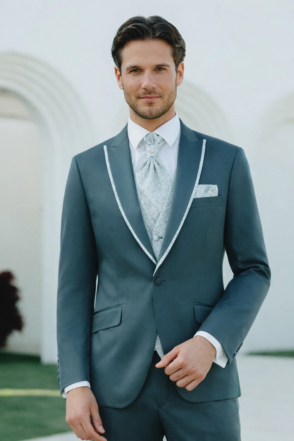 Abito sposo verde intenso dal carattere raffinato e contemporaneo. Il completo si distingue per il taglio sartoriale impeccabile e per la tonalità verde profonda, luminosa ma discreta, ideale per lo sposo che desidera un’alternativa sofisticata al classico blu. La giacca monopetto è valorizzata dal rever profilato a contrasto, dettaglio ricercato che incornicia la figura e dona slancio. Il gilet coordinato in tessuto damascato chiaro crea un raffinato gioco di texture, perfettamente abbinato alla cravatta plastron e alla pochette, per un risultato armonioso ed elegante. Un abito pensato per uno sposo moderno, attento ai dettagli, perfetto per matrimoni eleganti, location storiche o cerimonie all’aperto dal gusto contemporaneo. Ideale per chi cerca uno stile deciso, ma estremamente raffinato.