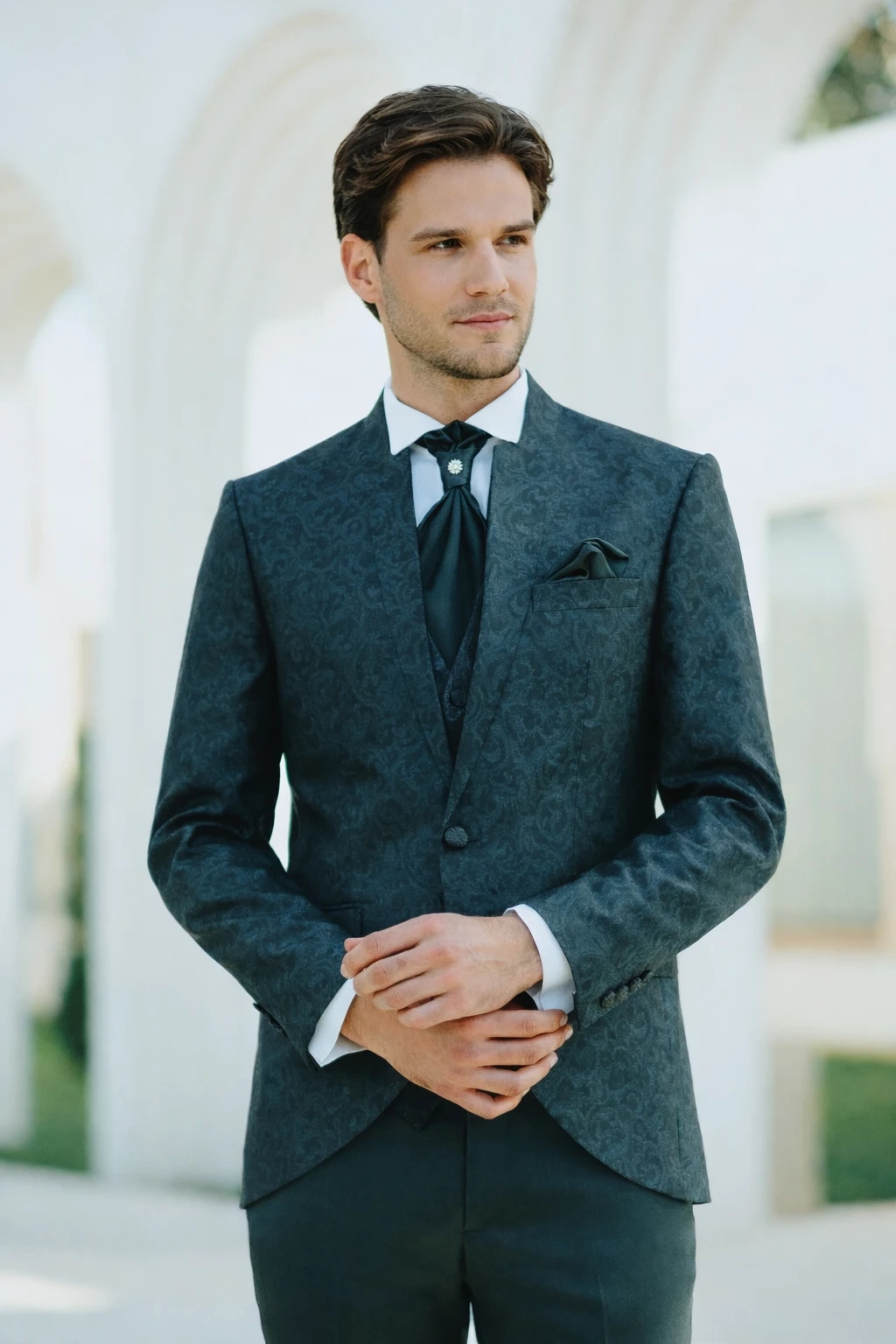 Abito sposo dal carattere deciso e sofisticato, realizzato in prezioso tessuto verde damascato che dona profondità e ricercatezza all’intero look. La giacca con collo coreana valorizza la linea in modo pulito e moderno, perfetta per lo sposo che desidera distinguersi con stile senza rinunciare all’eleganza formale. Il completo è arricchito da gilet coordinato e accessori in perfetta armonia, con cravatta gioiello e pochette abbinata che completano un’immagine raffinata e curata nei minimi dettagli. La vestibilità è impeccabile, studiata per slanciare la figura e garantire comfort per tutta la giornata. Un abito ideale per matrimoni eleganti, cerimonie serali o contesti esclusivi, pensato per uno sposo moderno che ama i dettagli sartoriali e uno stile distintivo ma senza tempo.