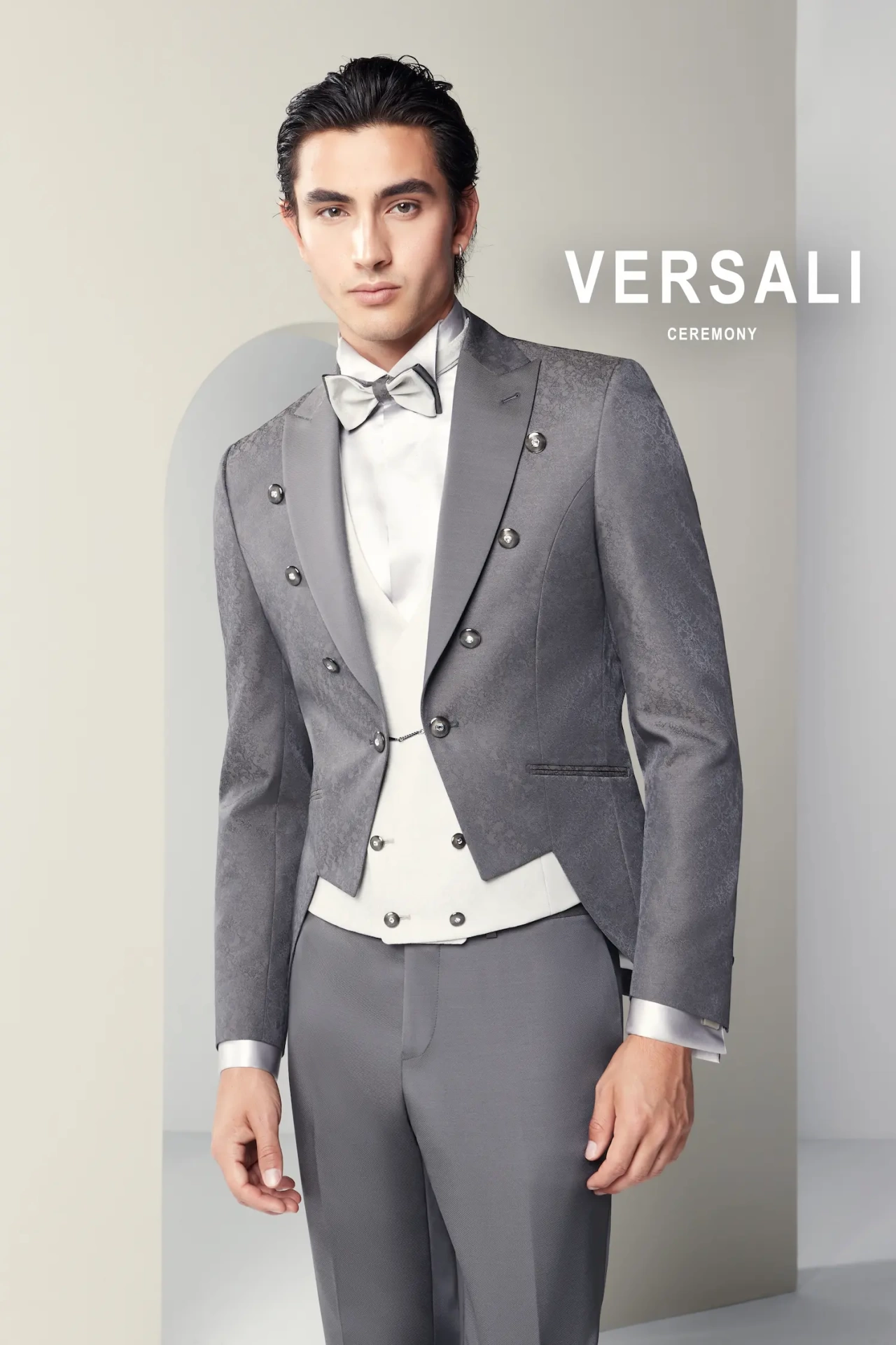 La giacca corta frac è realizzata in un raffinato tessuto jacquard tono su tono, impreziosito da bottoni gioiello che richiamano la tradizione sartoriale rivisitata in chiave moderna. Il rever classico incontra linee pulite e strutturate, creando un equilibrio perfetto tra stile formale e design attuale. Il gilet chiaro a contrasto illumina l’insieme e valorizza la silhouette, mentre il pantalone coordinato completa il look con sobrietà e precisione sartoriale. Il papillon tono su tono e la camicia bianca rendono l’outfit impeccabile e armonioso. Un abito sposo ideale per cerimonie eleganti, matrimoni serali o contesti raffinati, perfetto per chi cerca un frac non convenzionale ma estremamente chic, capace di lasciare il segno con discrezione e classe.