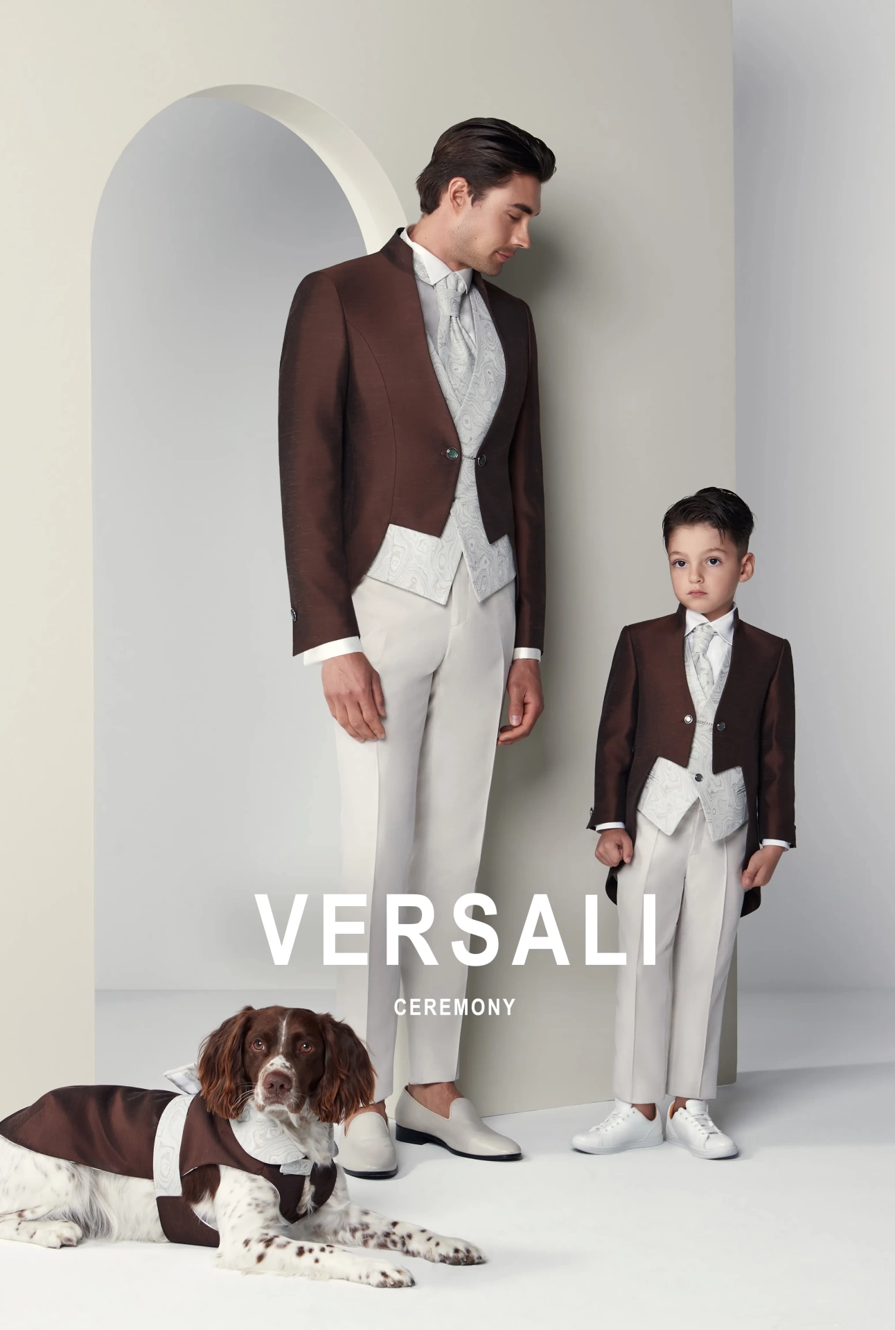 Questo frac coreana firmato Andrea Versali si distingue per il taglio pulito e moderno, pensato per chi desidera uno stile ricercato ma non convenzionale. La giacca coreana, dal design essenziale e strutturato, crea un contrasto raffinato con il pantalone chiaro, slanciando la figura e donando un’eleganza fresca e attuale. Il gilet coordinato e la camicia in tessuto lavorato completano il look con dettagli sartoriali di grande pregio. Un abito perfetto per cerimonie eleganti, matrimoni moderni o contesti raffinati, ideale per lo sposo che vuole distinguersi con discrezione e personalità.