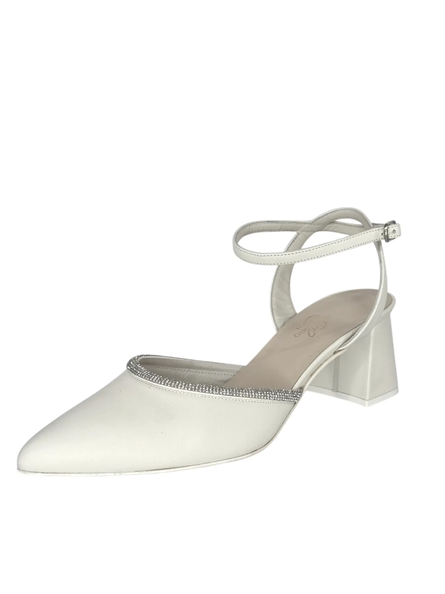 Una proposta chic e confortevole, perfetta per chi cerca eleganza con un tacco più stabile. Questo modello con cinturino alla caviglia valorizza il piede con una punta affusolata e un delicato profilo gioiello che illumina l’intera calzatura. Il tacco di 5 cm, largo e bilanciato, assicura una calzata comoda per tutta la giornata, ideale per cerimonie ed eventi importanti.